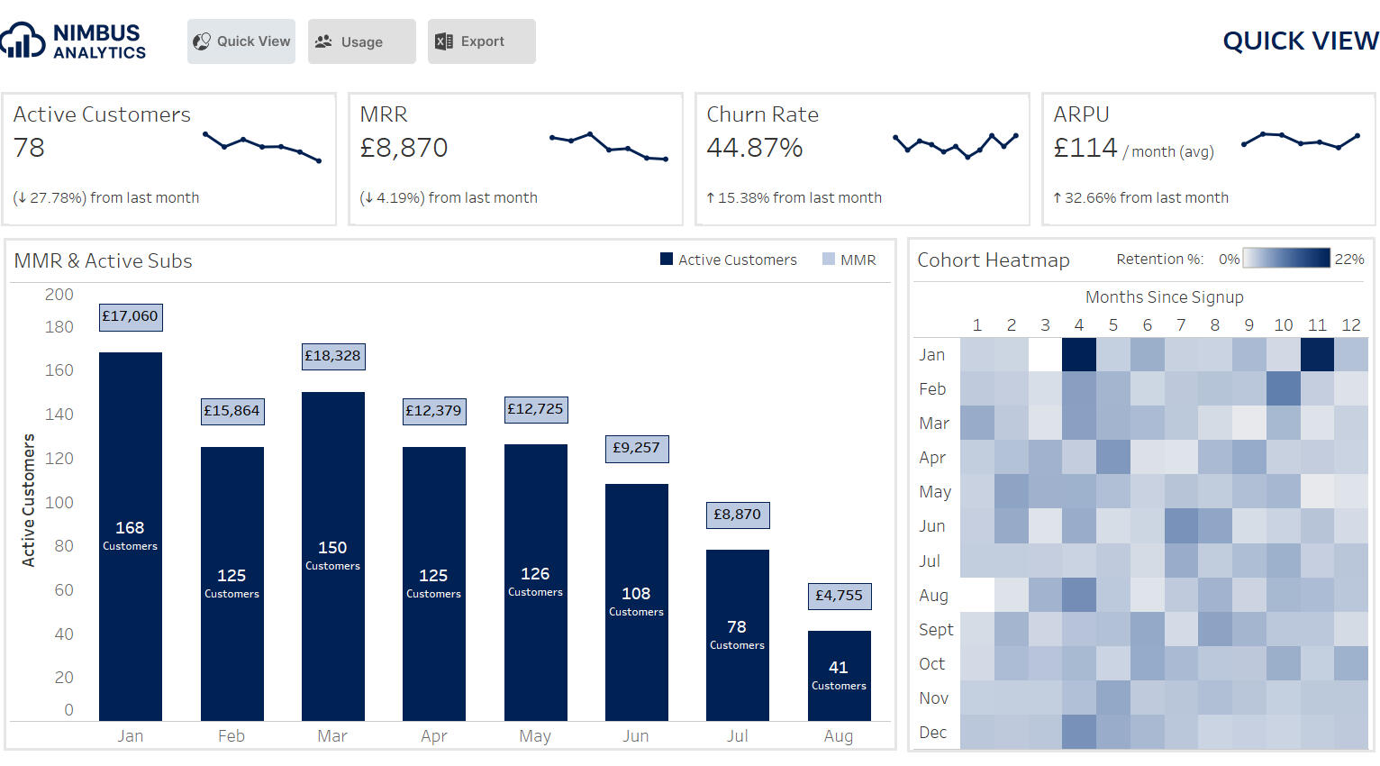 - Built a full executive dashboard highlighting churn patterns, usage drops, cohort trends, and early-warning signals.Outcome: