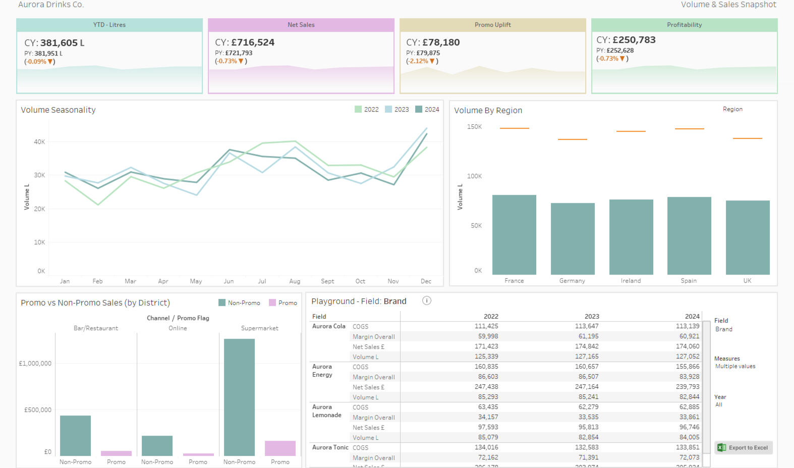 A soft drinks distributor needed a high-level performance dashboard to track volumes, revenue trends, and the impact of promotional activity across multiple brands.Challenge: